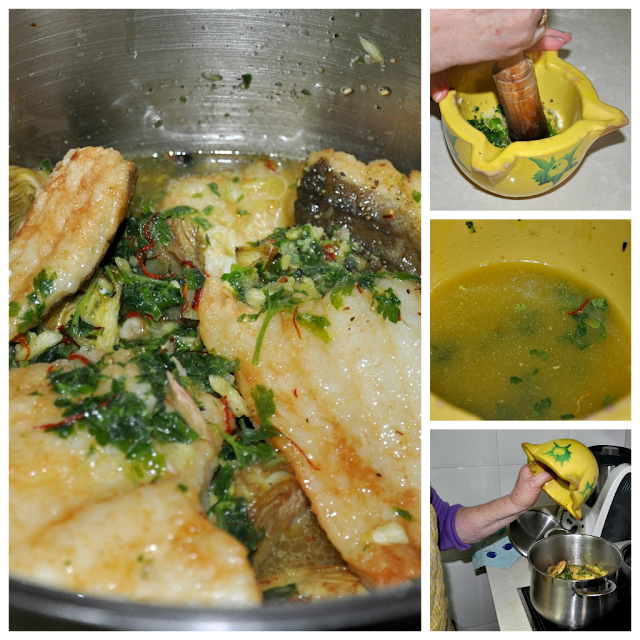Preparar un majado con ajo, perejil, azafrán en hebra y vino blanco y agregar a la olla. Dejar esta mezcla asentarse junto con el bacalao y las alcachofas durante 15 minutos a fuego lento.