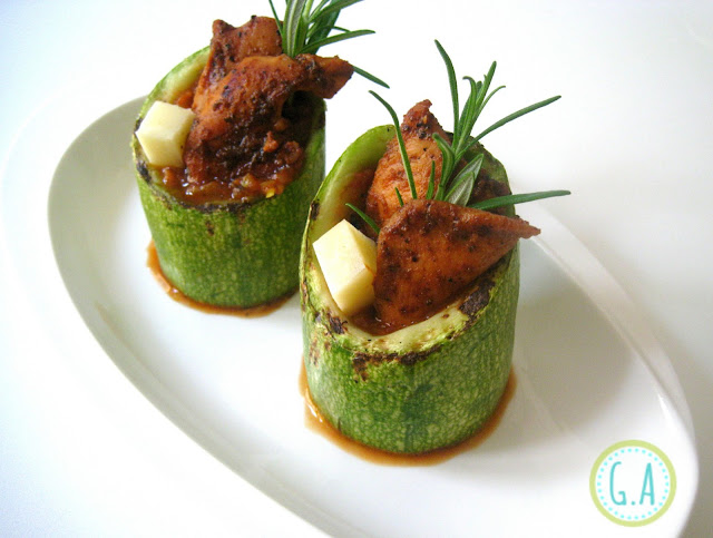Mi madre me envió unos calabacines blancos increíbles. Quería cambiar la típica receta de los rellenos de marisco o de salsa boloñesa que normalmente preparamos, así que buscando recetas por la web, he creado mi propia versión de estos maravillosos «Calabacines rellenos de pisto de mencía con pollo» del blog Recetas de Rechupete. Claro que he quitado cosas y he puesto otras, pero como bloggera considero importante revelar mis fuentes cuando la receta no es de mi propia cosecha. Entre otras cosas, elegí esta receta porque no necesita horno, ya que en mi piso de Granada no tengo, algunas veces pienso que así es mejor, pues no caigo en las tentaciones de la demoníaca repostería. Bueno, a ver que os parece esta deliciosa receta de calabacines blancos rellenos de pisto con vino tinto y pollo marindado.