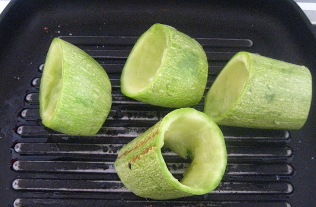 Mi madre me envió unos calabacines blancos increíbles. Quería cambiar la típica receta de los rellenos de marisco o de salsa boloñesa que normalmente preparamos, así que buscando recetas por la web, he creado mi propia versión de estos maravillosos «Calabacines rellenos de pisto de mencía con pollo» del blog Recetas de Rechupete. Claro que he quitado cosas y he puesto otras, pero como bloggera considero importante revelar mis fuentes cuando la receta no es de mi propia cosecha. Entre otras cosas, elegí esta receta porque no necesita horno, ya que en mi piso de Granada no tengo, algunas veces pienso que así es mejor, pues no caigo en las tentaciones de la demoníaca repostería. Bueno, a ver que os parece esta deliciosa receta de calabacines blancos rellenos de pisto con vino tinto y pollo marindado.