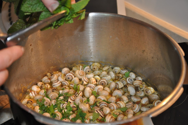 Una vez que tenemos todos los caracoles en el caldo, le picamos abundante hierbabuena fresca. Movemos y dejamos que el caldo vuelva nuevamente a hervir. En el caso de que soltaran espuma (las babas), retiramos con una espumadera. Rectificamos el caldo de sal, y ya están listos.