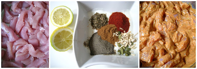 Para el marinado del pollo; 1 yogurt, el zumo de limón, 2 pechugas de pollo, 1 cucharadita de canela, 2 cucharaditas de comino, 1 cucharadita de cayena en polvo (2 si os gusta muy picante), 2 cucharaditas de pimienta negra, 2 de sal (esto depende de vuestro gusto también), 1 de cardamomos verdes, 1 de jengibre en polvo, 2 de garam masala.