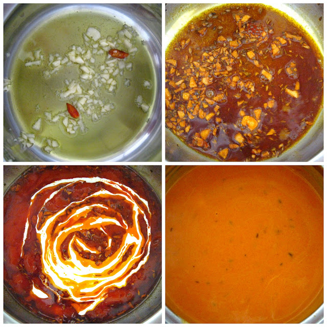 Para la salsa de tomate; Ajo picado en láminas, 1 cucharada de cominos, 2 de pimentón de la vera, un pack de tomate frito, 100gr de nata de cocinar, AOVE.