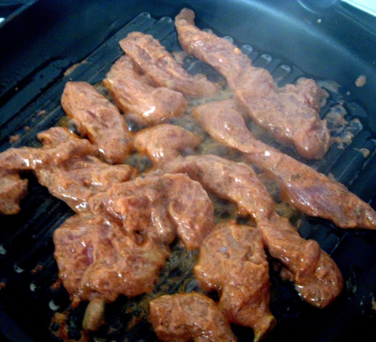 Finalmente escurrimos el pollo del macerado y lo ponemos en la plancha para que quede con un toque braseado. También se puede poner en brochetas y hacerlo en la barbacoa, así quedarían mucho más sabrosas. (Siento la calidad de las fotos, con el humo no conseguía sacar ninguna bien)
