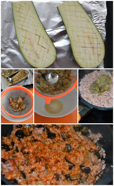 3. Mientras se escurren los jugos, en una sartén hacemos la carne picada de pollo, una vez hecha añadimos la berenjena y el tomate natural.