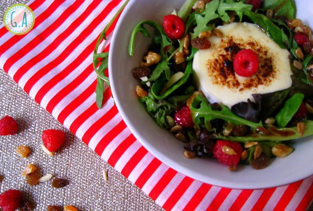 En un plato llano (así lo ponen en el restaurante) o en un bol para ensalada, ponemos las lechugas y sazonamos con la vinagreta de frambuesa. Echamos los frutos secos, las alcaparras, las frambuesas y justo en el centro ponemos el queso de cabra. Con un soplete le damos al queso color, lo gratinamos y lo dejamos tierno. Recomiendo hacer lo mismo por ambos lados del queso para que quede más cremoso.