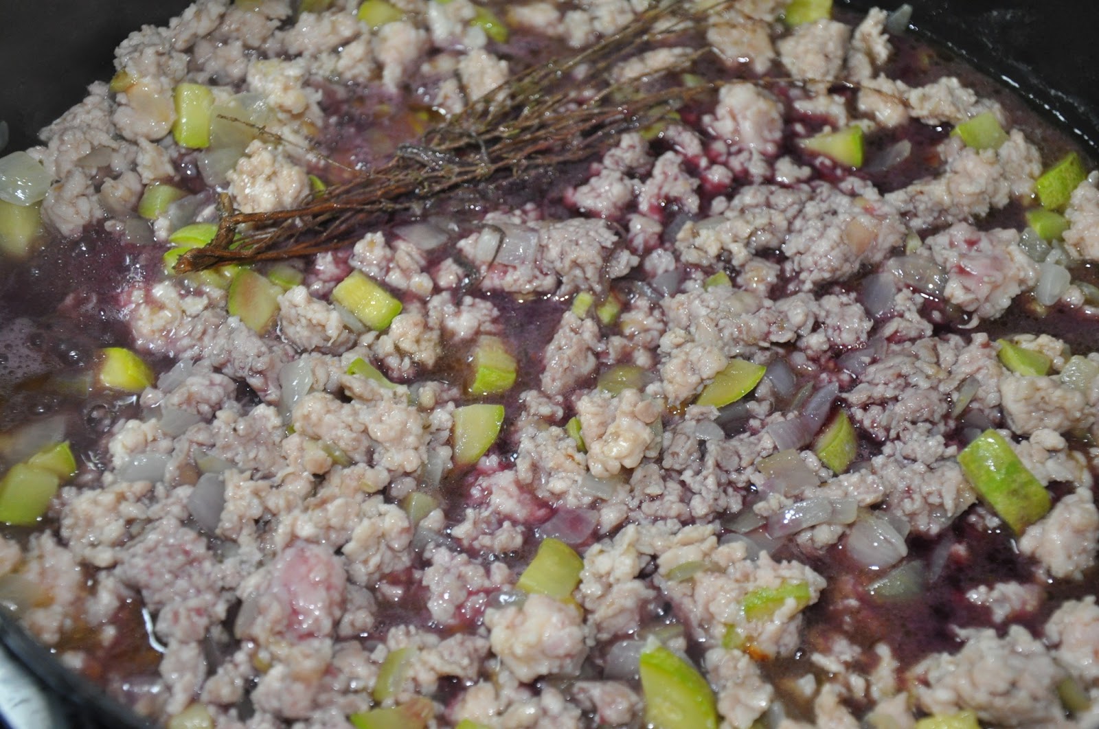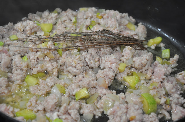 Añadimos la carne, y cuando comience a tener color, le agregamos la albahaca, el orégano y el tomillo.