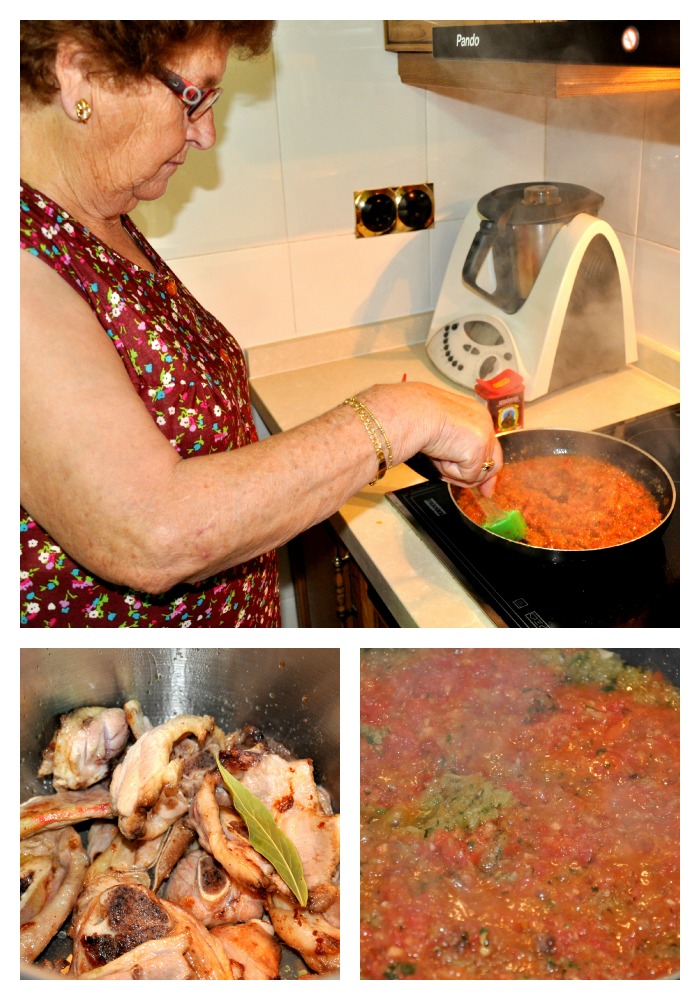 Agregamos a la cebolla y el resto de los ingredientes el tomate triturado y hacemos un sofrito, cuando ya este dorado, le echamos el pimentón dulce y picante y removemos hasta su completa disolución. Echamos el sofrito a la olla express (dónde ya habíamos puesto previamente el cordero), y si lo deseamos, echamos también unas zanahorias cortadas en rodajas