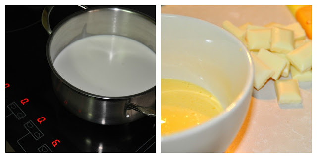 2 yemas de huevo, 100 gr de azúcar glass, 250 gr de leche entera, 250 gr de nata para montar, 1 tableta de chocolate blanco, 1 tableta de chocolate blanco con avellanas.