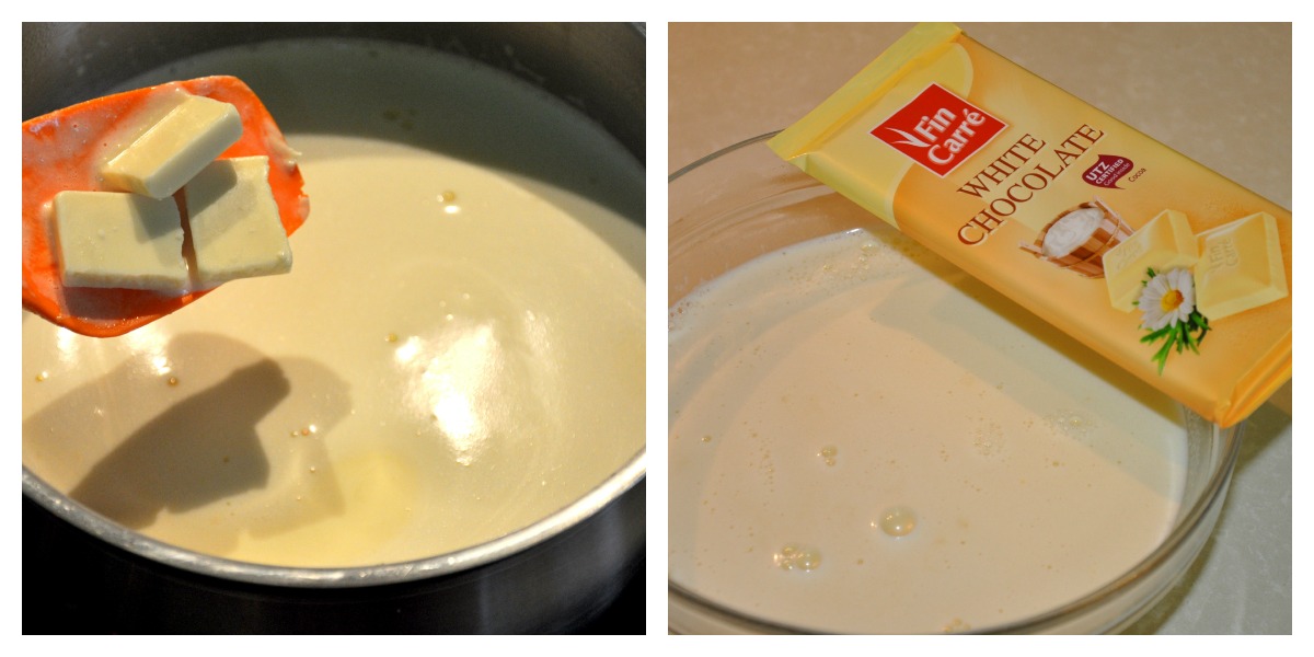 2 yemas de huevo, 100 gr de azúcar glass, 250 gr de leche entera, 250 gr de nata para montar, 1 tableta de chocolate blanco, 1 tableta de chocolate blanco con avellanas.