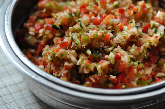 Lavamos y secamos y troceamos homogéneamente pero sin esforzarnos mucho todas las verduras (sin pelarlas). Las ponemos en el vaso, programamos 4 segundos, velocidad 4. Si es demasiada cantidad de verduras, repetimos la operación y lo hacemos en dos tandas.