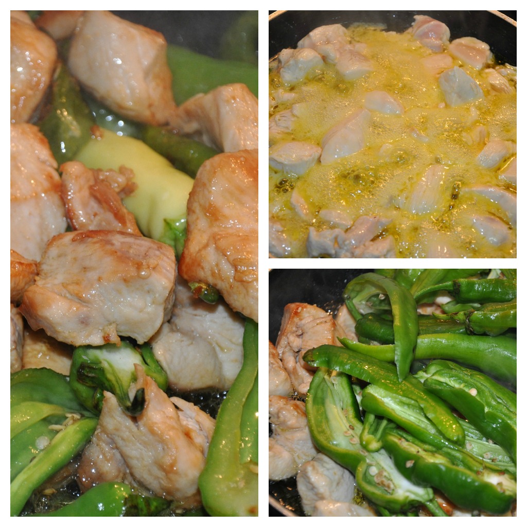 Preparación pollo con pimientos verdes y guindillas amarillas;