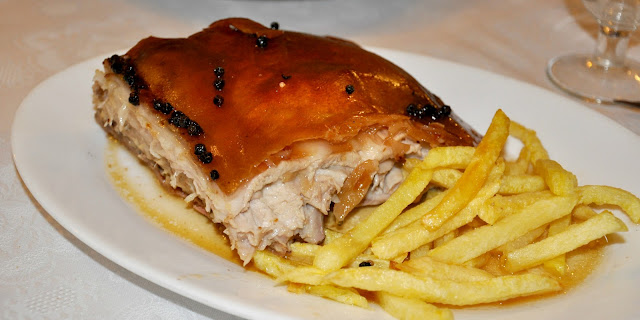 El cochinillo del restaurante casa curro, lo hacen en un horno de leña y con carne de la mejor calidad. Simplemente es un plato exquisito (aunque las patatas fritas, para mi gusto, sobran de este plato) con un original toque de pimientas negras a su alrededor.
