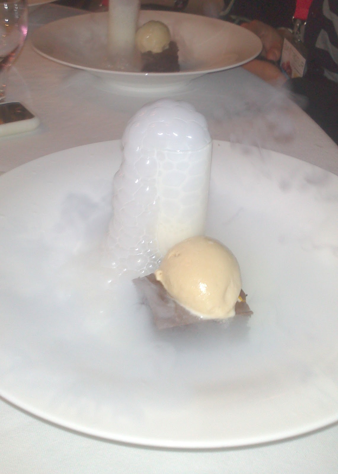 Sopa efervescente de arroz con leche, bizcocho de haba de cacao y piel de naranja sanguina y helado de chocolate rubio.