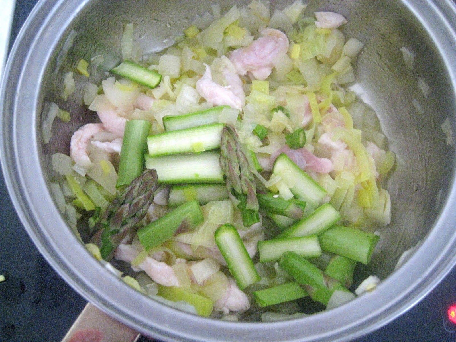 Añadimos los espárragos cortado en circulitos pequeños o en tiras, yo lo hice dos veces y me gustó más en circulitos como los de la foto final (los de este paso a paso son en tiras). Movemos unos segundos para incorporar y dorar las puntas de los espárragos que sacaremos para adornar el plato final. Agregamos el pollo desmenuzado del caldo que teníamos echo previamente y lo doramos un poco.