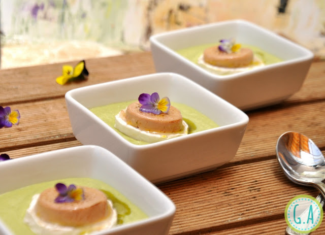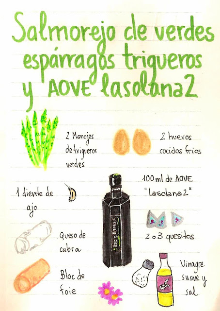 Hace unos días os hablé del AOVE «lasolana2«, y os dije que este aceite de variedad picual, todo lo que tocaba lo convertía en oro. Quería hacer una buena receta para acompañar al aceite, que quedara un conjunto en el que todos los ingredientes crearan una armonía entre sí y que se pudiera mojar pan y saborear todos los elementos. Creo que con este delicioso Salmorejo de espárragos trigueros con foie, queso de cabra lo conseguí, pues me ha encantado el color fruto de la fusión de los espárragos con el aceite y el toque desenfadado del gratinado de foie y queso de cabra.