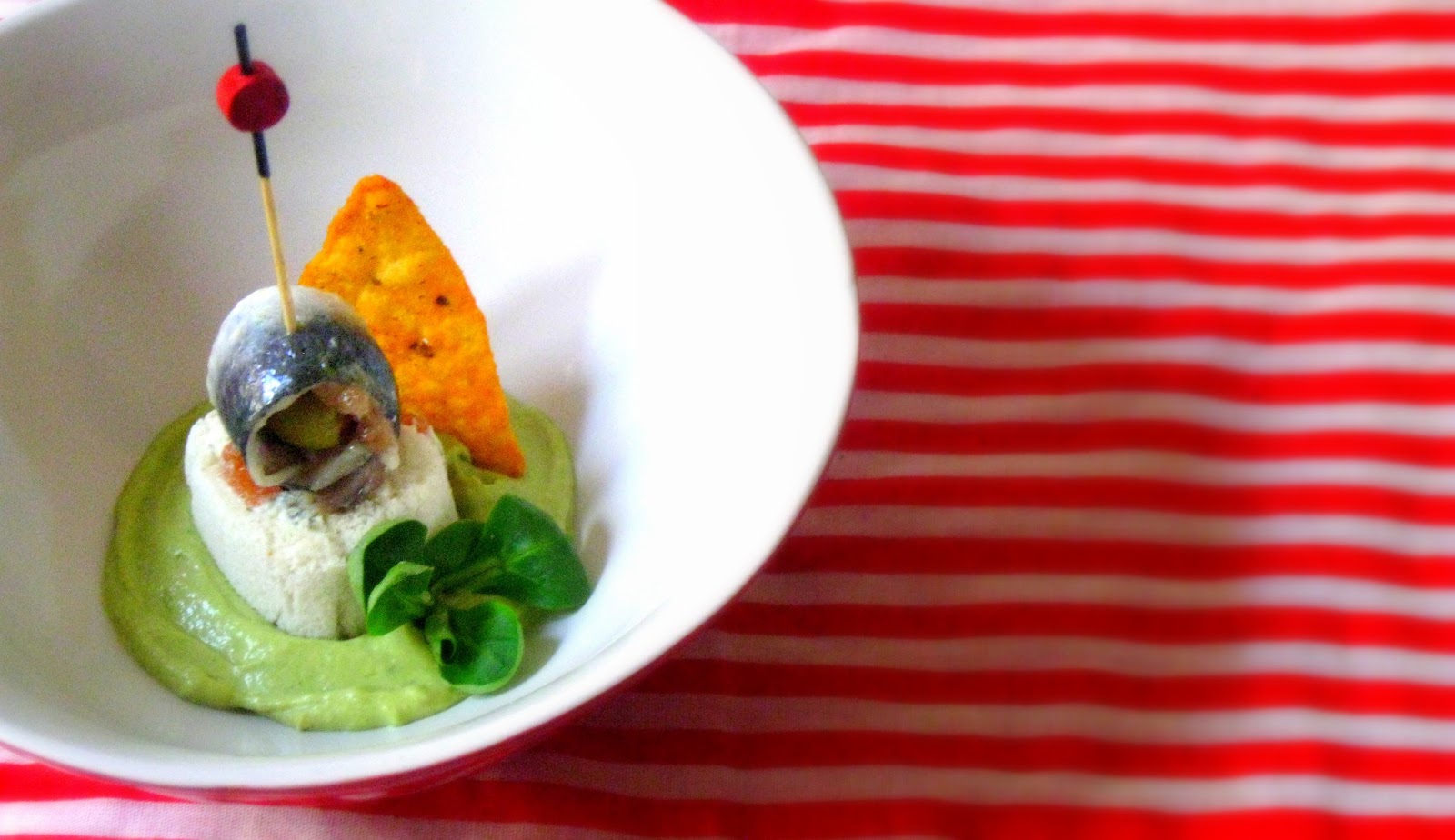 4. Para la presentación pondríamos el rolling y añadiremos el salmorejo de espárragos. Sobre el rolling colocaremos la sardina marinada enrollada en la aceituna y decoraremos a gusto con brotes, el crujiente de queso, el palillo, etc.