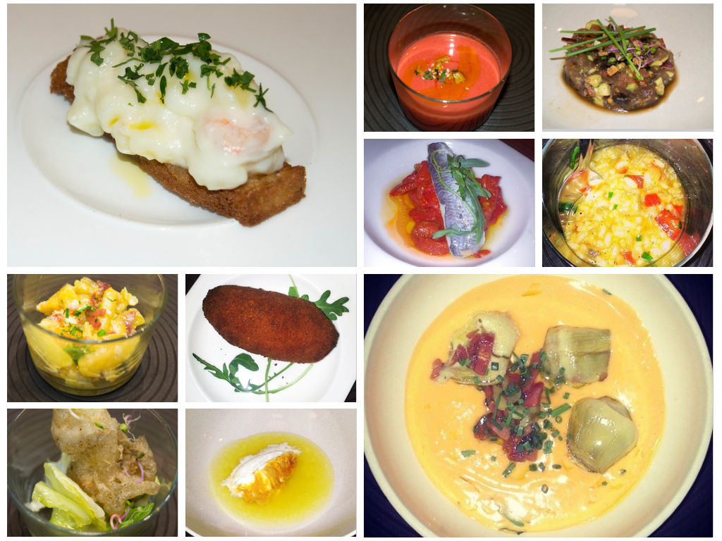 «10 Tapas del Saffron Sin Lactosa ni Gluten; Gazpacho de Fresones, Ensaladilla de Gambas sobre tosta crujiente, Sardina Maridada con pimientos al carbón, Tartar de atún Rojo,  Risotto de Setas y Azafrán, Croquetas de puerro, Huevos rotos con patatas a lo pobre, Porra Antequerana con Alcachofas a la montillana, Brocheta de tempura de pollo con manzana, Helado de nata con caramelo y sopa de cítricos».